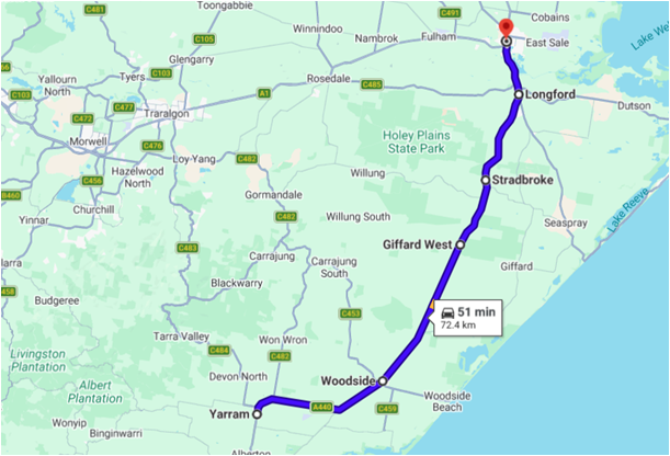 Yarram – Woodside – Giffard West – Stradbroke – Longford – Sale – Yarram