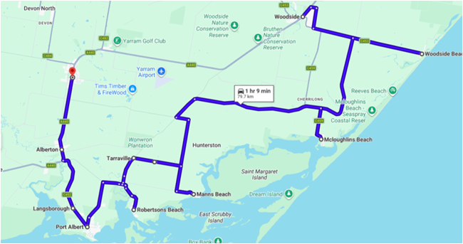 Yarram - Woodside – Woodside Beach – McLoughlins Beach – Manns Beach – Tarraville – Robertsons Beach – Port Albert – Langsborough – Alberton – Yarram