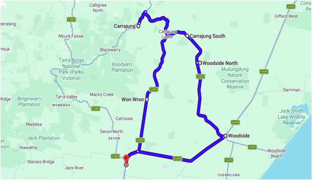 Yarram – Won Wron - Carrajung – Carrajung South – Woodside North – Woodside – Yarram