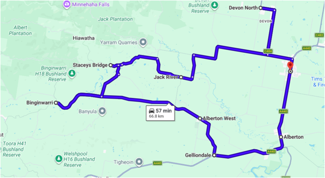 Yarram – Alberton – Gelliondale – Alberton West – Binginwarri – Staceys Bridge – Jack River – Devon North – Yarram